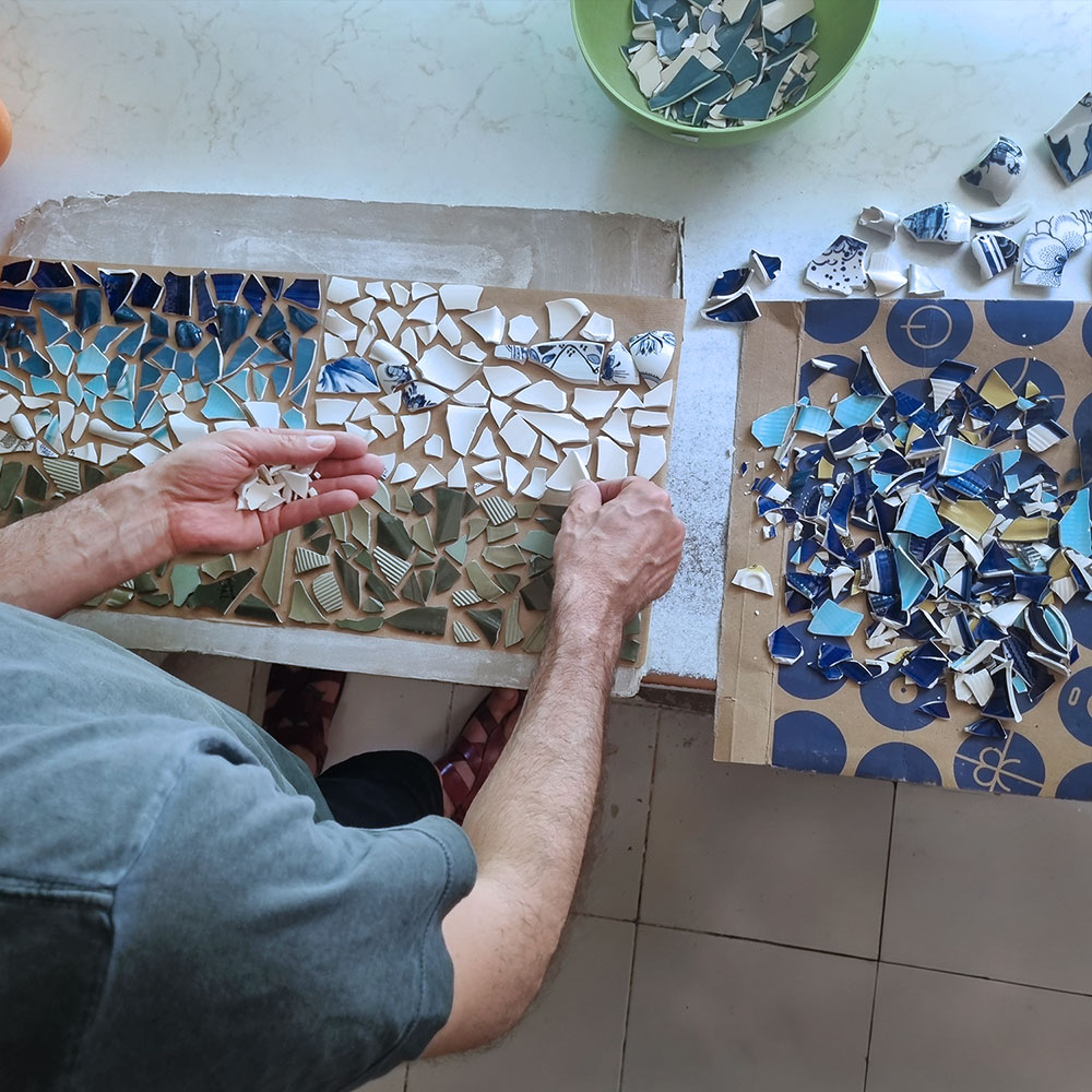 The materials of Resurrection are its primary storytellers. The project utilizes fragments of handmade pottery, each a carrier of centuries-old craftsmanship and human knowledge. By reimagining these discarded pieces, I transform them into a new mosaic composition titled New Horizons. These works do not hide their cracks; instead, they celebrate them as symbols of resilience and rebirth.